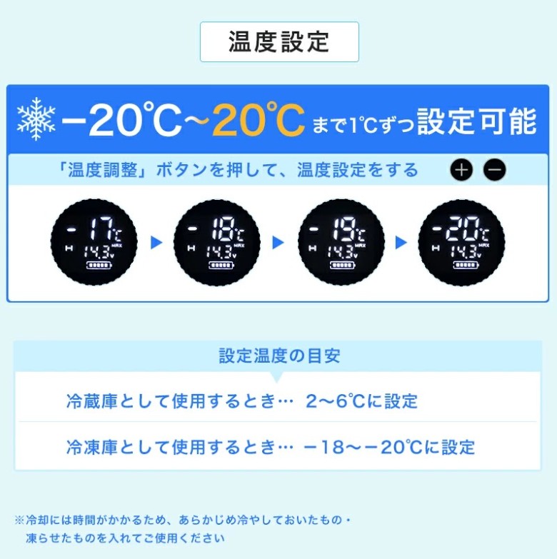 ・一般的なご家庭の冷蔵庫と同じコンプレッサー式で、最大-20℃の設定が可能